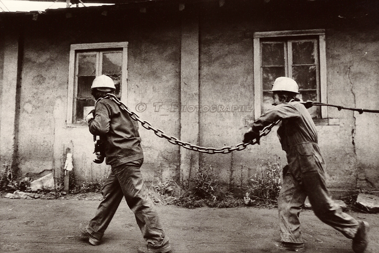 Deux fenêtres, deux hommes semblables tant dans leur tenue vestimentaire que dans leur démarche sont saisis dans l’exact encadrement des fenêtres, effet de miroir, voilà pour la forme. Une chaîne tant réelle que symbolique relie les deux hommes, mais aussi tous les hommes de la mine dans une même histoire : la chaîne, symbole de l’homme aliéné par son dur travail, mais aussi lien communautaire et intergénérationnel, voilà pour le fond. Brillante illustration de « La forme, c’est le fond qui remonte à la surface » (V. Hugo).